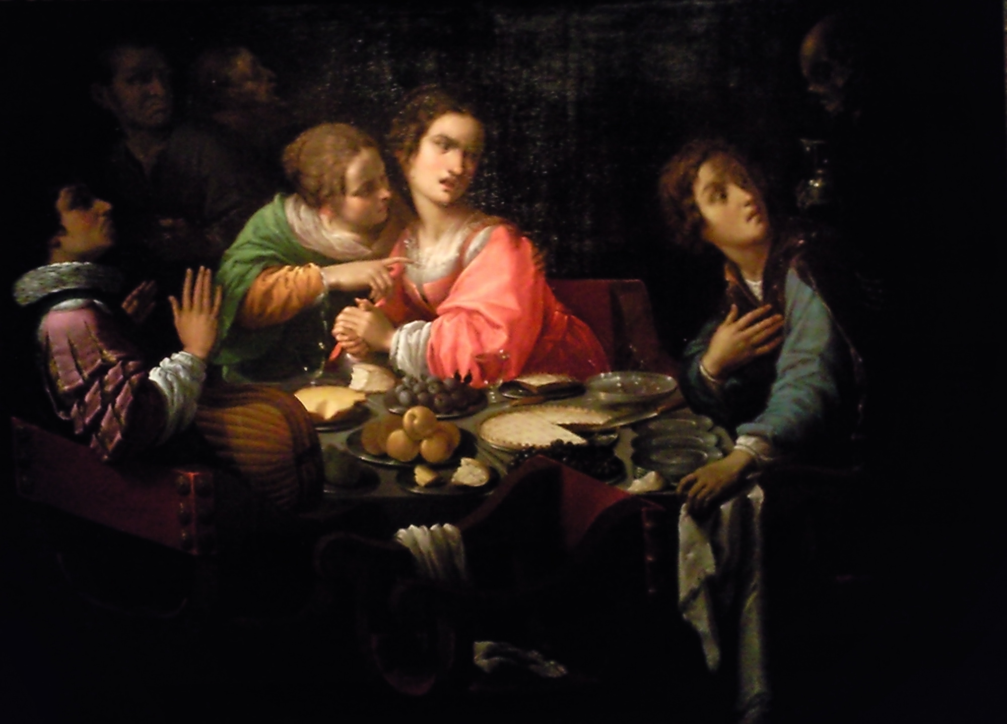 Au même moment, ce repas, bien que tourné du côté de la vie, est interrompu par l’apparition de la mort (sous la forme d’un squelette, surgissant en haut à droite du tableau – mais difficile à distinguer sur cette photographie), qui confère à la scène vivacité et épaisseur dramatique.