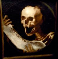 Par leur simple regroupement, toutes ces « Vanités » se trouvent réduites à un signe brandi au point d’en devenir caricatural, comme cet enfant jouant au football avec un crâne [4], ou cette grosse tête de mort, fluo et stylisée « japanimation » [5].