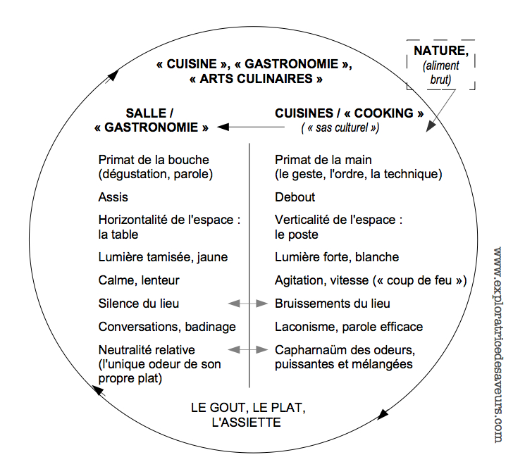 En réalité, on constate que les propos généralement tenus sur la « cuisine » se placent tantôt du point de vue de l’action, de la préparation des aliments, de l’acte de cuisiner (dans la cuisine), tantôt du côté du produit de cette action, des mets cuisinés, de la cuisine telle qu’elle se présente dans l’assiette – se plaçant ici du point de vue de la consommation.