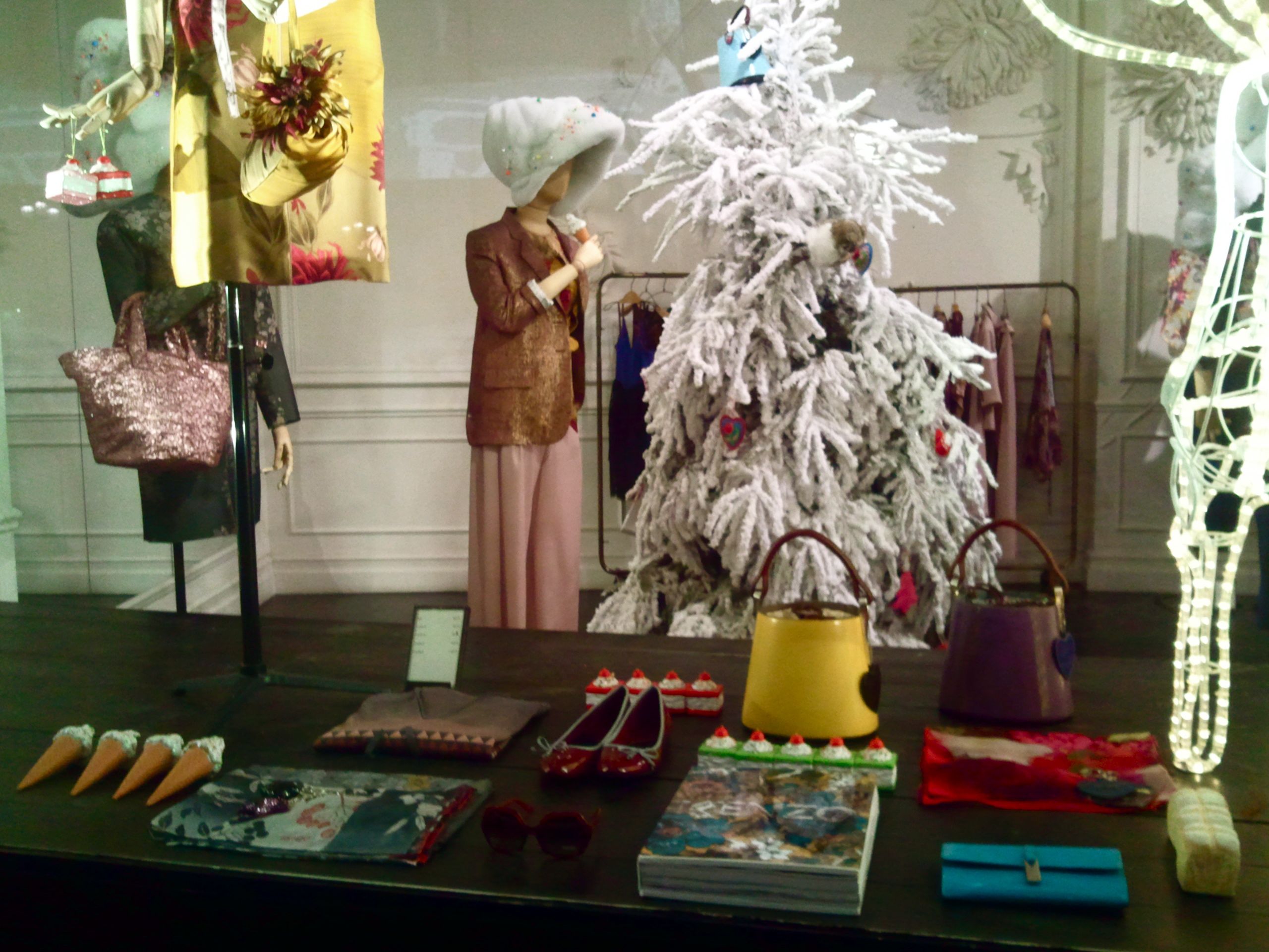 – On retrouve dans ces vitrines les symboles de la pâtisserie française, parisienne même (brioche, croissant, éclairs …), placés ici comme des fétiches pour incarner le chic, la rencontre entre haute-couture et haute cuisine … ? Peut-être même sont-ce des réalisations de pâtissiers de renom ?